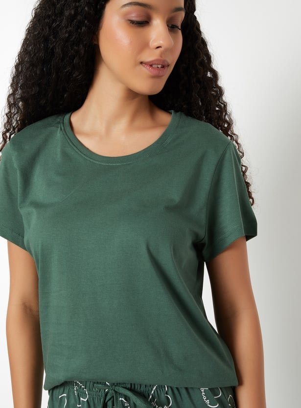 Unwind in style with this printed PJ set, featuring a T-shirt with a round neck and half sleeves, paired with printed pyjamas designed with a drawstring waist and handy pockets. Comfortable and playful, it’s perfect for lounging or bedtime.